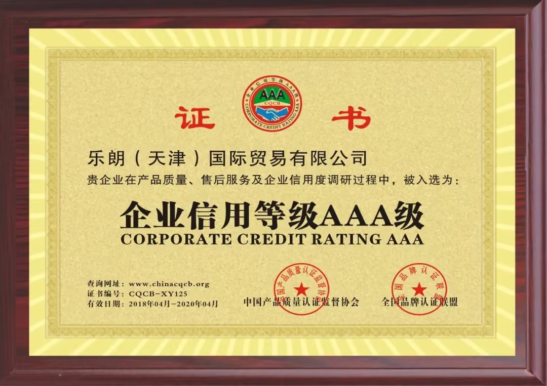 自2018年起,樂朗國際連續多年被評為:3A級信用企業;質量、服務、誠信3AAA企業;消費者放心滿意品牌