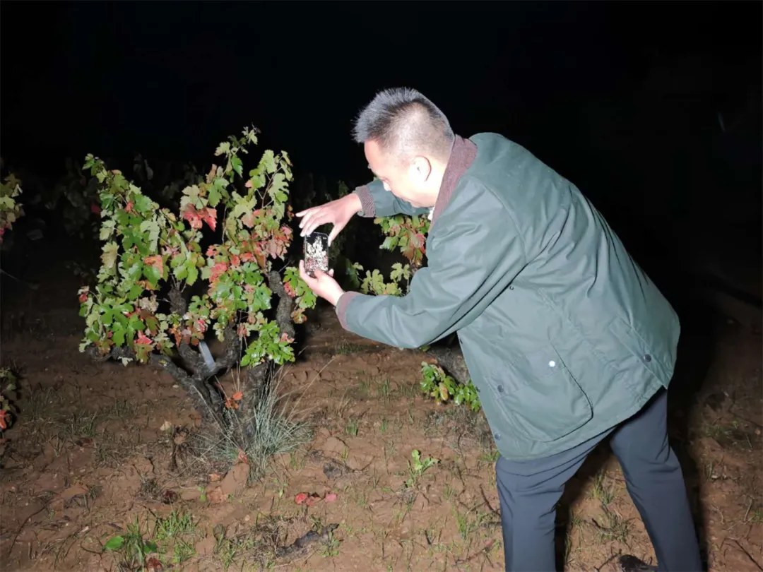 隨后,莊主帶領(lǐng)溯源團(tuán)夜訪酒莊的老藤葡萄園。酒莊葡萄園占地一共25公頃,以70-80年老藤葡萄為主,種植的葡萄品種有佳麗釀,希拉,歌海娜,慕合懷特等;為了迎合市場(chǎng)需要,園內(nèi)還新增了白葡萄品種馬卡貝奧。