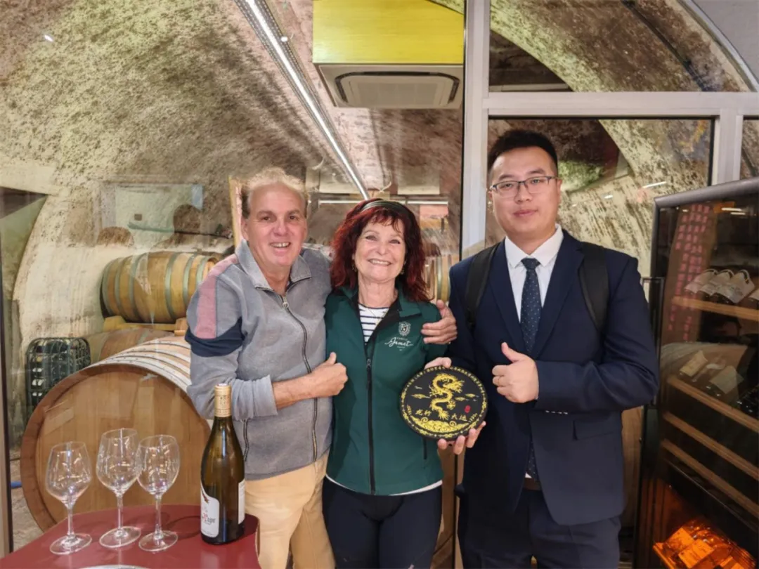 參觀完畢,莊主請溯源團品鑒了酒莊的特色葡萄酒,同時還準備了豐富的美食款待溯源團。隨后,雙方在愉悅的氣氛中,互贈禮品,合影留念。