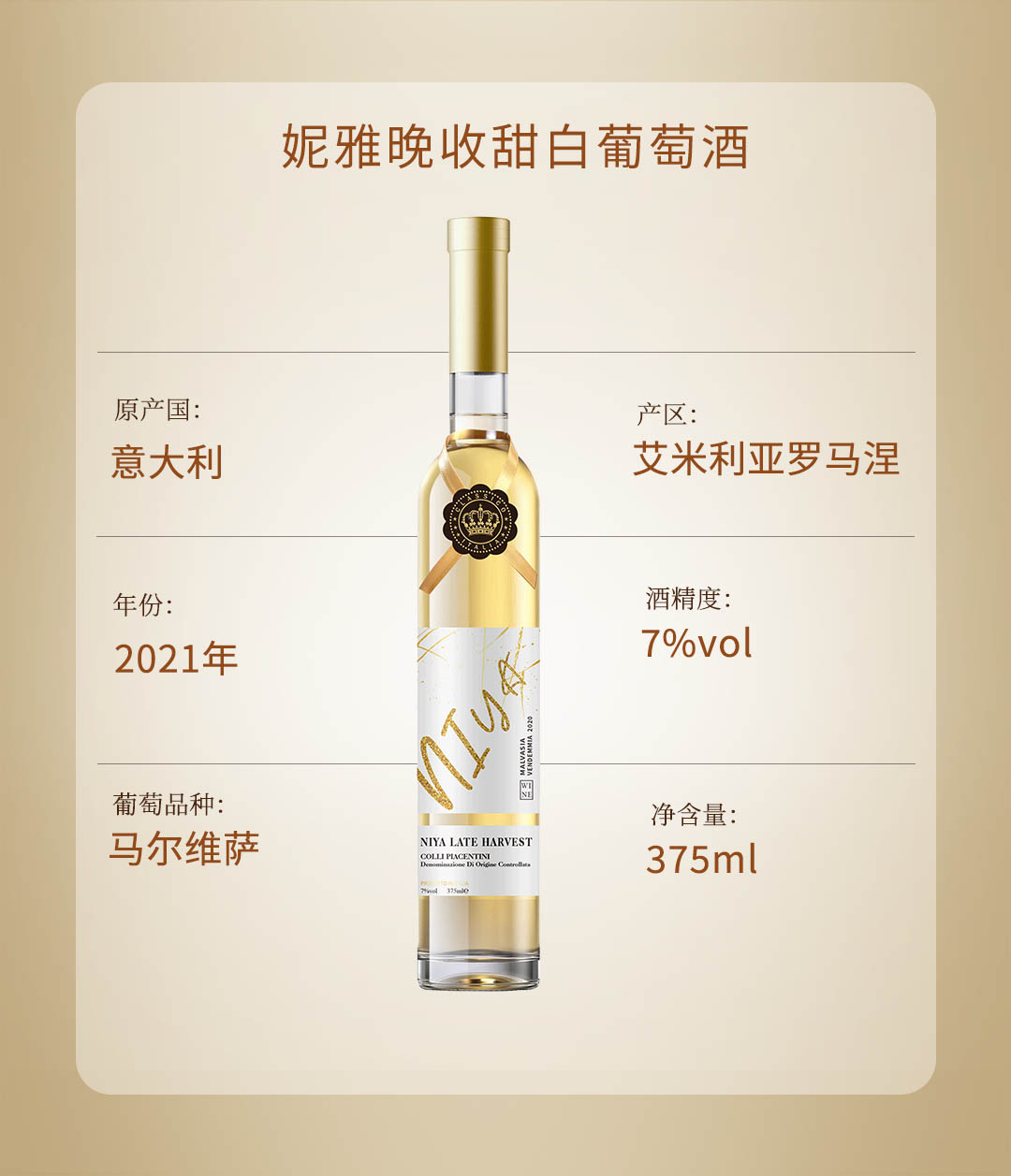發布時間:2025/4/19 9:34:57 點擊:143次2024 年國際葡萄與葡萄酒組織(OIV)報告顯示,意大利甜白葡萄酒出口量同比激增 27%,其中艾米利亞 - 羅馬涅產區的妮雅晚收甜白以高品質為核心優勢,輔以藝術化瓶身設計,深受中國甜白葡萄酒愛好者的青睞。