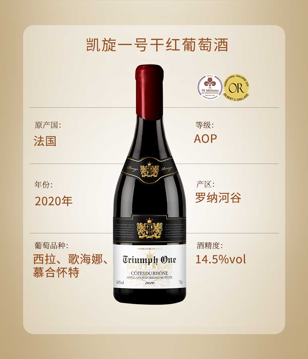發布時間:2025/4/19 9:50:52 點擊:161次羅納河谷,法蘭西葡萄酒文明的搖籃,兩千年釀酒史詩,20余種法定葡萄,GSM 經典混釀,締造驚艷世界葡萄酒版圖的佳話。凱旋一號萃取自然風土精髓,經 12個月橡木桶陳釀,以“平衡的口感、濃郁的香氣”,致敬這片傳奇之地。
